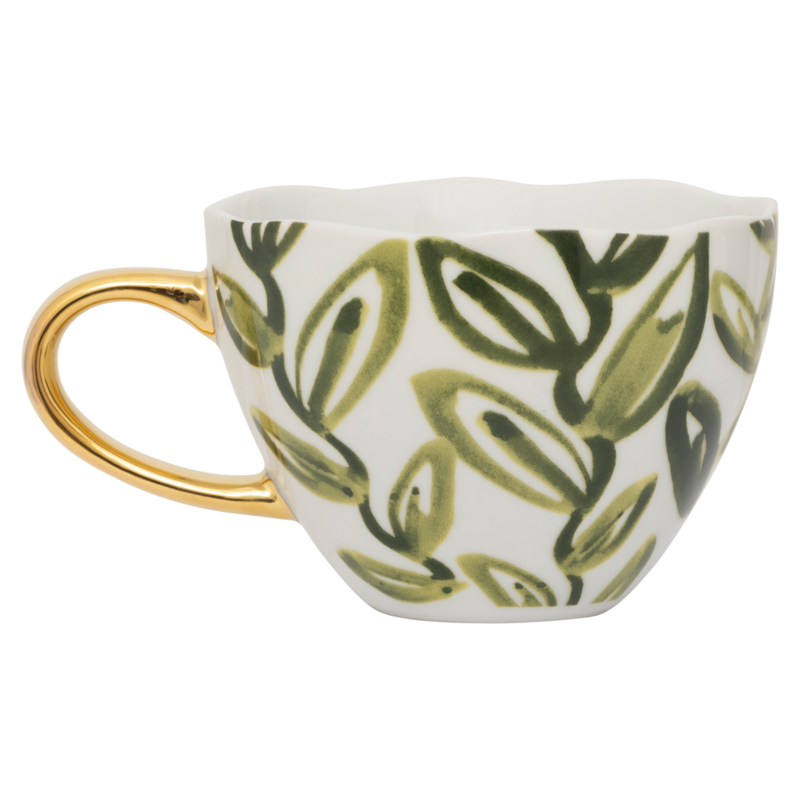 OverzichtDeze Good Morning Cup met limited print komt uit de collectie van het Nederlandse merk Urban Nature Culture. Het handgeschilderde design van olijfgroene bladeren wrapt de mok in botanische rust. Het 350ml formaat is perfect voor je ochtendkoffie of thee in de middag, terwijl het expressieve design zorgt voor een vrolijke touch aan elke moment van de dag. Het gouden detail voegt elegantie toe aan uw dagelijkse ritueel.