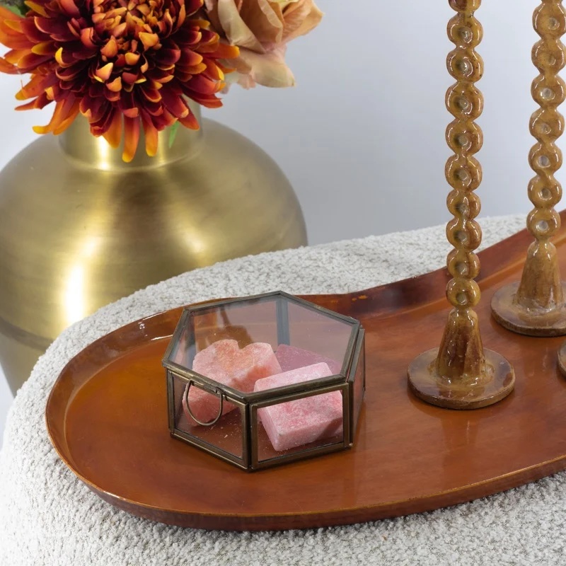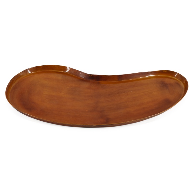 OverzichtDit metalen dienblad is afkomstig uit de collectie van het merk HomeBound by KY. Het organisch gevormde dienblad is gemaakt van metaal en heeft een oranje/cognackleurige afwerking. Dit dienblad is 52 bij 24 cm groot en heeft een opstaande rand van 2 cm hoog.