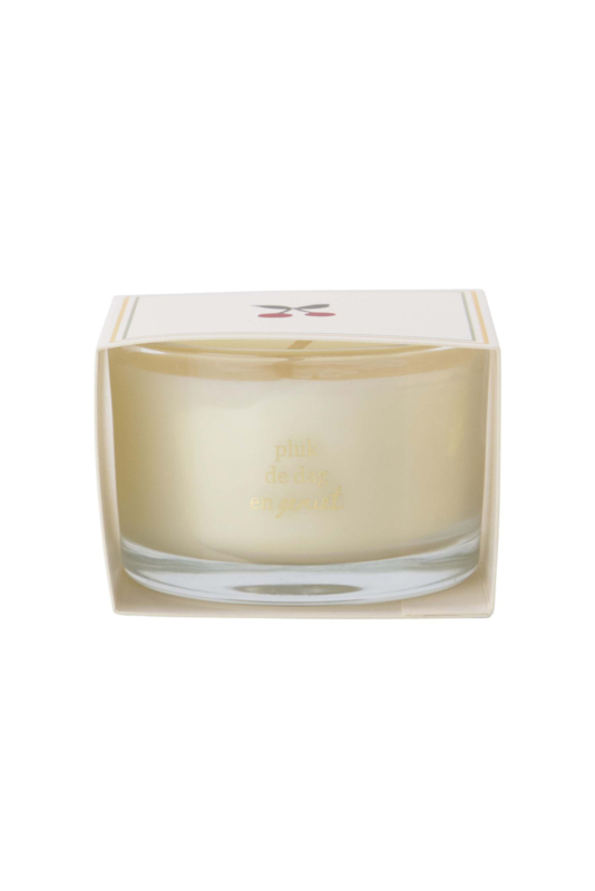 OverzichtDeze geurkaars in wikkel komt uit de nieuwe cadeau collectie van het merk Zusss. De kaars zit verpakt in een glaasje met daarom heen een witte wikkel. Op de wikkel staat een afbeelding van twee vrolijke kersen in een kader. Op het glaasje staat met goudkleurige sierletters 'pluk de dag en geniet'. Door deze mooie wikkel en tekst is de kaars een heel leuk om cadeau te geven. De geurkaars verspreidt een heerlijke frisse geur wanneer je hem brand.