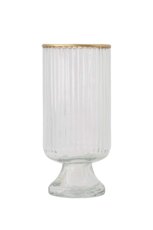 OverzichtDit leuke vaasje komt uit de nieuwe homecollectie van Zusss. Het kleine vaasje is gemaakt van transparant ribbelglas met een gouden randje aan de bovenkant en staat op een voetje. Door de geringe hoogte van 13 centimeter is dit vaasje ook ideaal voor op een salontafel. Combineer het vaasje met de grotere variant of een leuke kandelaar van Zusss en maak je eigen combinatie.