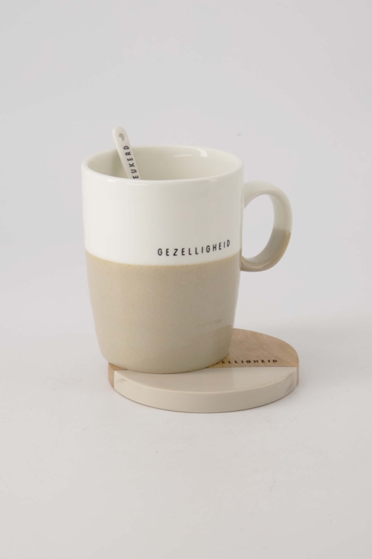 Geniet van een lekker kopje thee met deze toffe theemok van Zusss in een hele nieuwe stijl! Dit mokje met oor is gemaakt van aardewerk en is wit aan de bovenkant en zandkleurig aan de onderkant. Op de voorkant staat 'gezelligheid' en het herkenbare Zusss logo staat op de onderkant. De theemok heeft een inhoud van 300 ml. Door de lieve tekst is dit mokje ook super leuk om cadeau te geven!