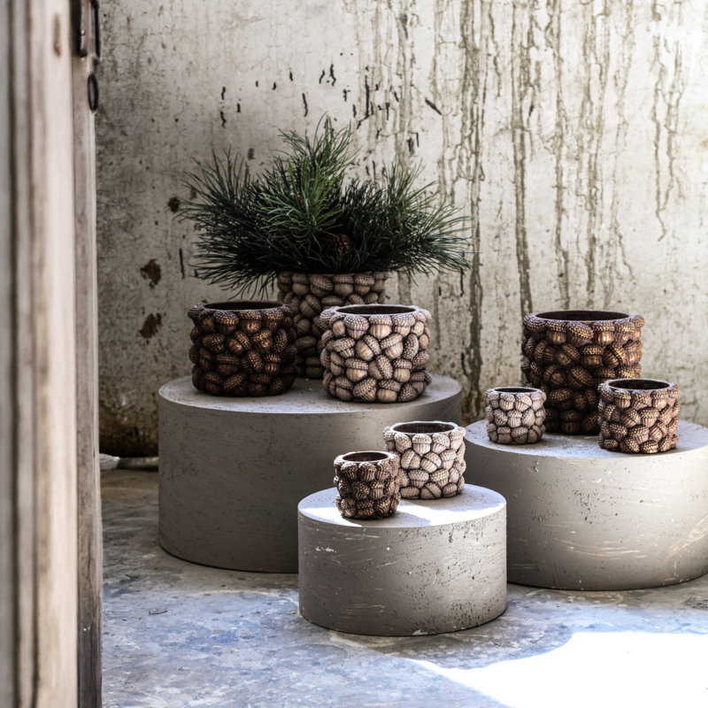 OverzichtPot Coni is afkomstig uit de collectie van het Nederlandse merk PTMD. Deze eikel bloempot is gemaakt van cement en is verkrijgbaar in een donkerbruine variant met een gouden touch. Pot Coni is verkrijgbaar in diverse maten.