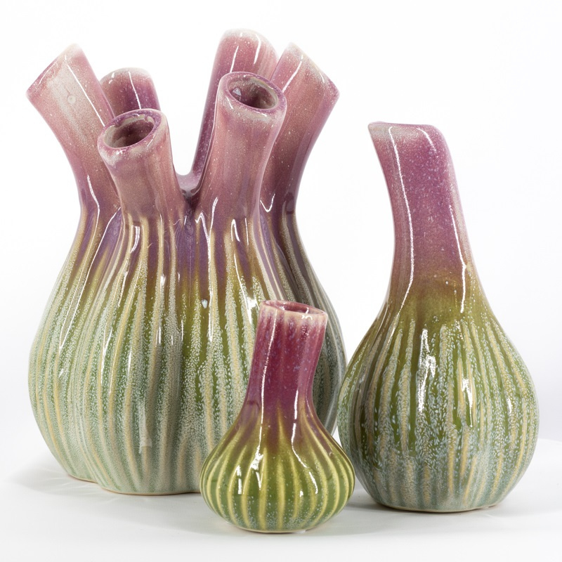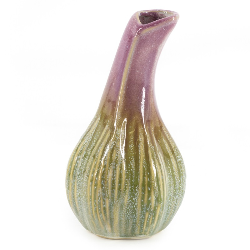 OverzichtDit tweekleurige tulpenvaasje is afkomstig uit de collectie van het merk HomeBound by KY. De sierlijke vaas heeft één openingen, geschikt voor een klein boeketje (kunst)tulpen of een ander bloempje/takje. De gestreepte vaas heeft een dip-dye afwerking in paars met groen.