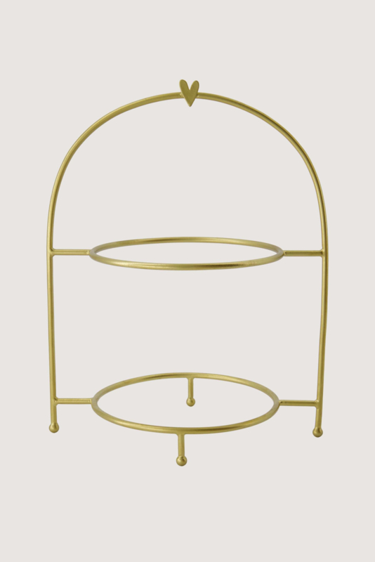 OverzichtDeze leuke etagere is afkomstig uit de koken en tafelen collectie van het merk Zusss. Op de goudkleurige etagere is plaats voor twee borden en hiermee kun jij verschillende lekkernijen uitstallen op je gedekte tafel. In het midden van het rond lopende handvat aan de bovenkant zit een lief goudkleurig Zusss hartje. De etagere is geschikt om een gebaksbordje of een klein rond serveerschaaltje op te plaatsen en past hiermee prima bij het overige servies van Zusss!