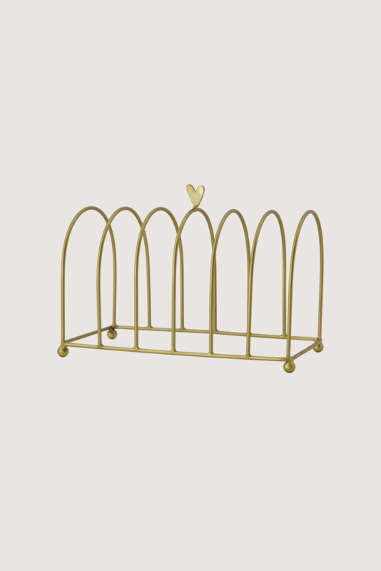 OverzichtDit leuke rekje is afkomstig uit de koken en tafelen collectie van het merk Zusss. Het rekje is perfect om toast, geroosterd brood of creakers in te plaatsen en er is plaats voor zes sneedjes. Op de middelste boog van het broodrekje zit een lief goudkleurig Zusss hartje. Met de goudkleurige afwerking en het lieve hartje past Dit rekje perfect bij het overige servies van Zusss.