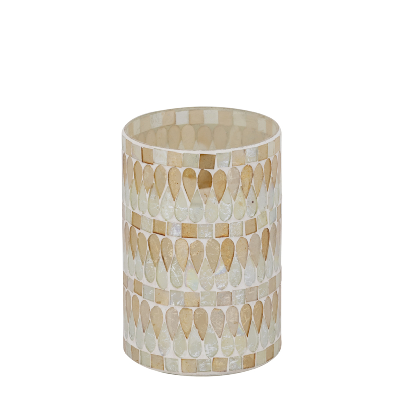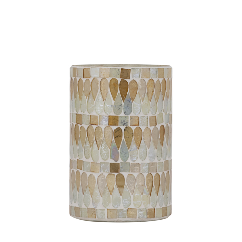 OverzichtWindlicht Zadie komt uit de collectie van het merk PTMD. Het sfeervolle theelicht is gemaakt van glas, ingelegd met mozaïk in lichte natureltinten. Het windlicht is verkrijgbaar in drie maten en schijnt prachtig met een brandend theelicht of stompkaars erin.