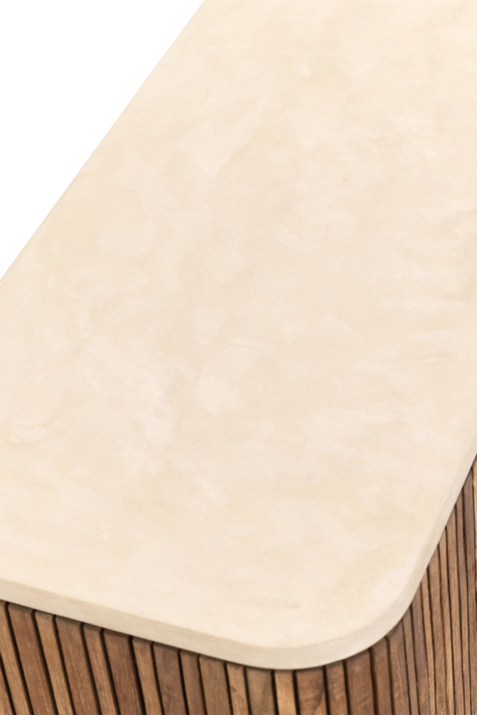 OverzichtDit unieke TV meubel komt uit de Lagoon collectie van DTP Home. De kast combineert naturel gerecycled hout met op de bovenkant een blad van Mortex en daaronder een metalen frame. Mortex is een nieuw materiaal wat steeds vaker te zien is in meubelstukken. Mortex bestaat voor 95% uit natuurproducten zoals mineralen, kalk en cement. Deze mix wordt handmatig aangebracht en hierdoor krijg je een unieke structuur en uitstraling, en een materiaal wat bijna net zo hard is als natuursteen. Elk blad vervaardigd uit Mortex is dan ook uniek.