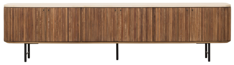 Dit TV meubel heeft afgeronde hoeken en is helemaal gesloten. Verticale groeven in het geleefde hout geven het meubel een retro tintje. Het gebruikte hout komt hierdoor prachtig uit en ook het zandkleurige bovenblad van Mortex komt op dit lage meubel goed tot zijn recht. Met zes gesloten deuren bied TV meubel Lagoon ook de nodige opbergruimte voor apparteur en dergelijke. De kast heeft de volgende afmetingen: 55x220x35 cm (HxBxD). De kasten in deze collectie hebben een onderstel van dunne, ronde poten en handknoppen in dezelfde stijl.