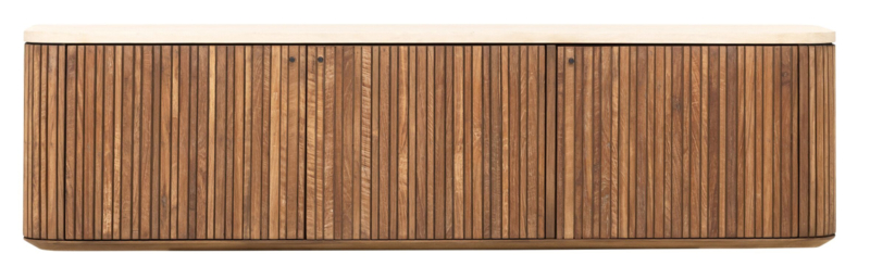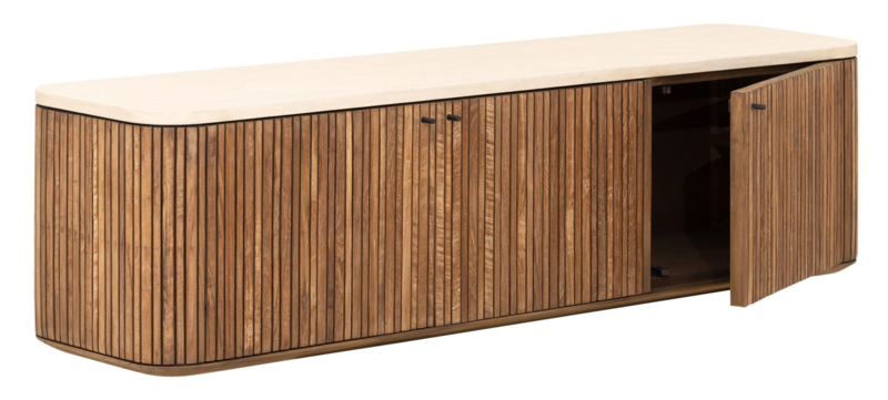 Dit TV meubel heeft afgeronde hoeken en is helemaal gesloten. Verticale groeven in het geleefde hout geven het meubel een retro tintje. Het gebruikte hout komt hierdoor prachtig uit en ook het zandkleurige bovenblad van Mortex komt op dit lage meubel goed tot zijn recht. Met drie gesloten deuren bied TV meubel Lagoon ook de nodige opbergruimte voor apparteur en dergelijke. De kast heeft de volgende afmetingen: 37x140x35 cm (HxBxD).