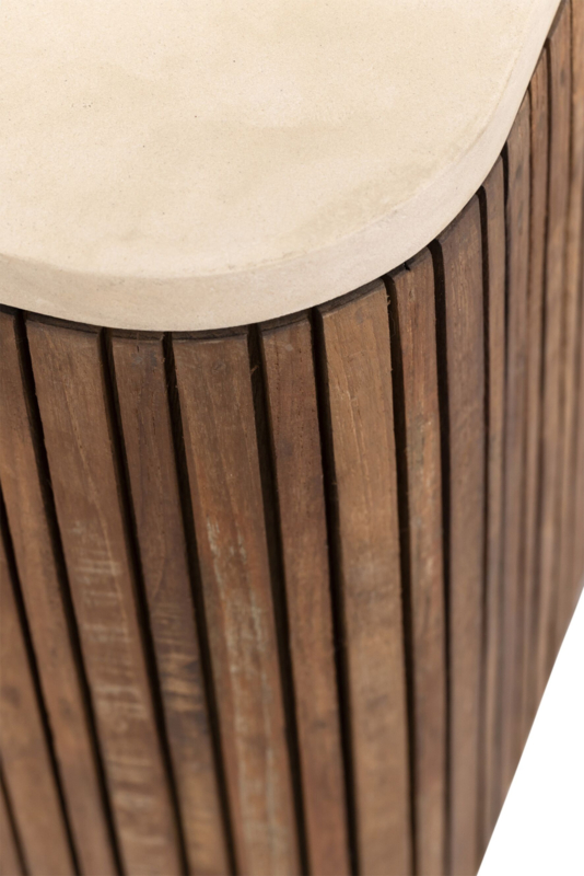 OverzichtDit unieke TV meubel komt uit de Lagoon collectie van DTP Home. De kast combineert naturel gerecycled hout met op de bovenkant een blad van Mortex. Mortex is een nieuw materiaal wat steeds vaker te zien is in meubelstukken. Mortex bestaat voor 95% uit natuurproducten zoals mineralen, kalk en cement. Deze mix wordt handmatig aangebracht en hierdoor krijg je een unieke structuur en uitstraling, en een materiaal wat bijna net zo hard is als natuursteen. Elk blad vervaardigd uit Mortex is dan ook uniek.