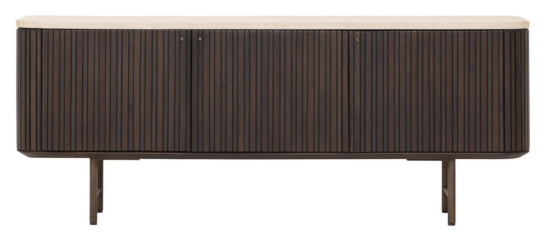 Dit TV meubel heeft afgeronde hoeken ,is helemaal gesloten en het hout heeft een warme donkerbruine afwerking. Verticale groeven in het donker gekleurde hout geven het meubel een retro tintje. Het hout komt hierdoor prachtig uit en ook het zandkleurige bovenblad van Mortex komt op dit lage meubel goed tot zijn recht. Met drie gesloten deuren bied TV meubel Maroon ook de nodige opbergruimte voor apparteur en dergelijke. De kast heeft de volgende afmetingen: 55x140x35 cm (HxBxD). De kasten in deze collectie hebben een onderstel van dunne, ronde poten en handknoppen in dezelfde stijl.
