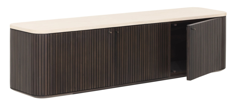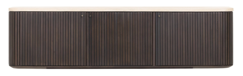 Dit TV meubel heeft afgeronde hoeken ,is helemaal gesloten en het hout heeft een warme donkerbruine afwerking. Verticale groeven in het donker gekleurde hout geven het meubel een retro tintje. Het hout komt hierdoor prachtig uit en ook het zandkleurige bovenblad van Mortex komt op dit lage meubel goed tot zijn recht. Met drie gesloten deuren bied TV meubel Maroon ook de nodige opbergruimte voor apparteur en dergelijke. De kast heeft de volgende afmetingen: 37x140x35 cm (HxBxD).