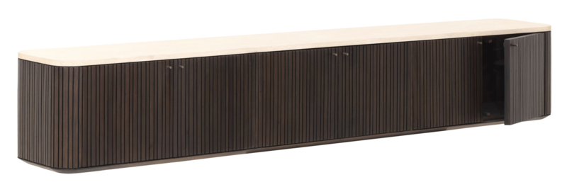 Dit TV meubel heeft afgeronde hoeken ,is helemaal gesloten en het hout heeft een warme donkerbruine afwerking. Verticale groeven in het donker gekleurde hout geven het meubel een retro tintje. Het hout komt hierdoor prachtig uit en ook het zandkleurige bovenblad van Mortex komt op dit lage meubel goed tot zijn recht. Met zes gesloten deuren bied TV meubel Maroon ook de nodige opbergruimte voor apparteur en dergelijke. De kast heeft de volgende afmetingen: 37x220x35 cm (HxBxD).