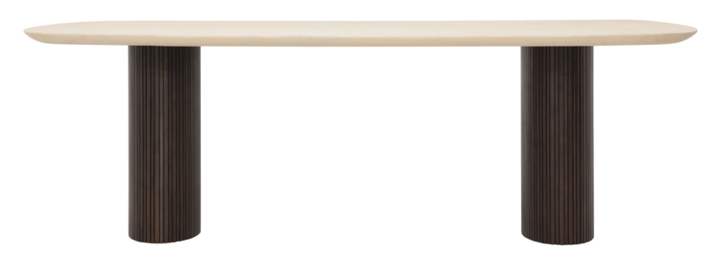 OverzichtDeze prachtige eettafel is afkomstig uit de Maroon collection van DTP Home. Het Deens ovale blad in een lichte Sand kleur rust op twee masieve eveneens ovalen poten. Het tafelblad is gemaakt van Mortex, een nieuw materiaal wat steeds vaker te zien is in meubelstukken. Mortex bestaat voor 95% uit natuurproducten zoals mineralen, kalk en cement. Deze mix wordt handmatig aangebracht en hierdoor krijg je een unieke structuur en uitstraling, en een materiaal wat bijna net zo hard is als natuursteen. Elk meubelstuk vervaardigd uit Mortex is dan ook uniek. De poten zijn gemaakt van Mahoniehout met een warme donkerbruine afwerking. In de poten zit een vertikaal ribbelpatroon wat steeds terug komt in de Maroon serie.