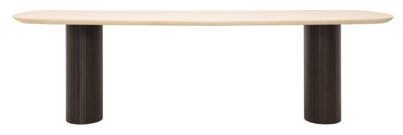 OverzichtDeze prachtige eettafel is afkomstig uit de Maroon collection van DTP Home. Het Deens ovale blad in een lichte Sand kleur rust op twee masieve eveneens ovalen poten. Het tafelblad is gemaakt van Mortex, een nieuw materiaal wat steeds vaker te zien is in meubelstukken. Mortex bestaat voor 95% uit natuurproducten zoals mineralen, kalk en cement. Deze mix wordt handmatig aangebracht en hierdoor krijg je een unieke structuur en uitstraling, en een materiaal wat bijna net zo hard is als natuursteen. Elk meubelstuk vervaardigd uit Mortex is dan ook uniek. De poten zijn gemaakt van Mahoniehout met een warme donkerbruine afwerking. In de poten zit een vertikaal ribbelpatroon wat steeds terug komt in de Maroon serie.