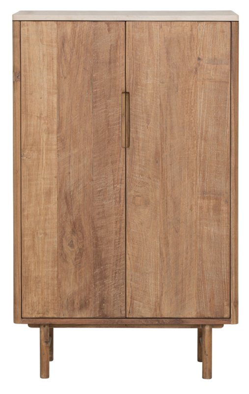 OverzichtDeze bergkast is afkomstig uit de Bliss collection van DTP Home. De kast combineert naturel gerecycled hout met op de bovenkant een blad van Mortex. Mortex is een nieuw materiaal wat steeds vaker te zien is in meubelstukken. Mortex bestaat voor 95% uit natuurproducten zoals mineralen, kalk en cement. Deze mix wordt handmatig aangebracht en hierdoor krijg je een unieke structuur en uitstraling, en een materiaal wat bijna net zo hard is als natuursteen. Elk blad vervaardigd uit Mortex is dan ook uniek. De natuurlijke rustige uitstaling maakt deze kast makkelijk te combineren is verschillende interieurstijlen. Deze uitvoering heeft de volgende afmetingen: 130x80x40 cm (HxBxD) en is voorzien van 2 deuren met daarachter 2 planken. Met deze maten bied bergkast Bliss voldoende opbergruimte en is toch compact en hierdoor makkelijk te plaatsen in ook een kleinere ruimte.