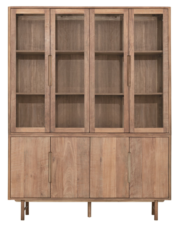 OverzichtDeze vitrinekast is afkomstig uit de Bliss collection van DTP Home. De kast is helemaal gemaakt van gerecycled teakhout in een lichte naturel kleur. De natuurlijke rustige uitstaling maakt deze kast makkelijk te combineren is verschillende interieurstijlen. Deze uitvoering heeft de volgende afmetingen: 210x160x40 cm (HxBxD) en is voorzien van 4 deuren met glas met daarachter 2 planken aan de bovenkant. Het onderdeel heeft 4 dichte deuren en hierachter bevind zich 1 plank. Met deze maten bied vitrinekast Bliss ruim voldoende opbergruimte in zowel het boven als onderste deel.