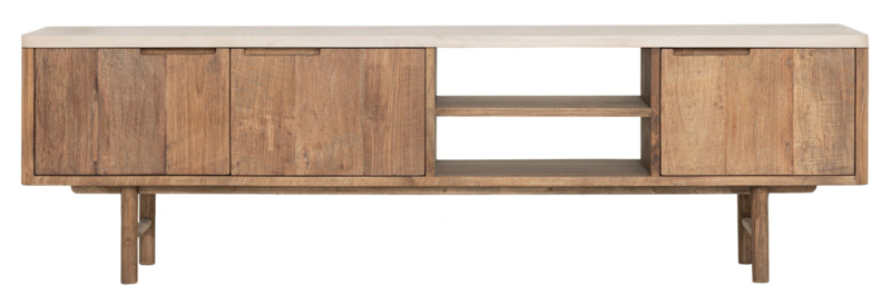 OverzichtDit TV meubel is afkomstig uit de Bliss collection van DTP Home. Dit meubel is helemaal gemaakt van gerecycled teakhout in een lichte naturel kleur gecombineerd met een bovenblad van Mortex in een lichte zandkleur. Mortex is een nieuw materiaal wat steeds vaker te zien is in meubelstukken. Mortex bestaat voor 95% uit natuurproducten zoals mineralen, kalk en cement. Deze mix wordt handmatig aangebracht en hierdoor krijg je een unieke structuur en uitstraling, en een materiaal wat bijna net zo hard is als natuursteen. Elk blad vervaardigd uit Mortex is dan ook uniek.