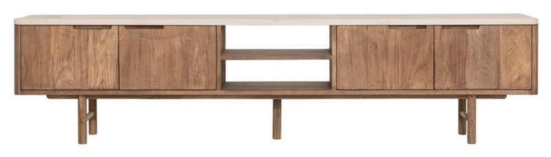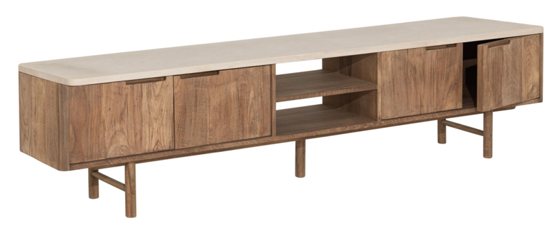 OverzichtDit TV meubel is afkomstig uit de Bliss collection van DTP Home. Dit meubel is helemaal gemaakt van gerecycled teakhout in een lichte naturel kleur gecombineerd met een bovenblad van Mortex in een lichte zandkleur. Mortex is een nieuw materiaal wat steeds vaker te zien is in meubelstukken. Mortex bestaat voor 95% uit natuurproducten zoals mineralen, kalk en cement. Deze mix wordt handmatig aangebracht en hierdoor krijg je een unieke structuur en uitstraling, en een materiaal wat bijna net zo hard is als natuursteen. Elk blad vervaardigd uit Mortex is dan ook uniek.