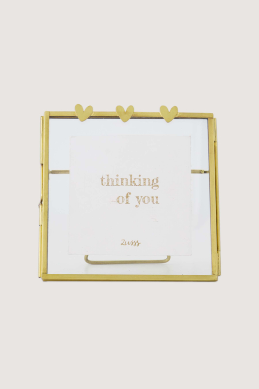 OverzichtDit fotolijstje is afkomstig uit de nieuwe cadeaucollectie van het merk Zusss. Het decoratieve lijstje van goudkleurig metaal en glas is geschikt om een afbeelding in te plaatsen. Ook een mooie kaart of foto kan natuurlijk. Drie lieve Zusss hartjes sieren de bovenkant van dit mooie lijsttje. Geef het lijstje cadeau met een leuke foto erin en je hebt een perfect cadeautje!
