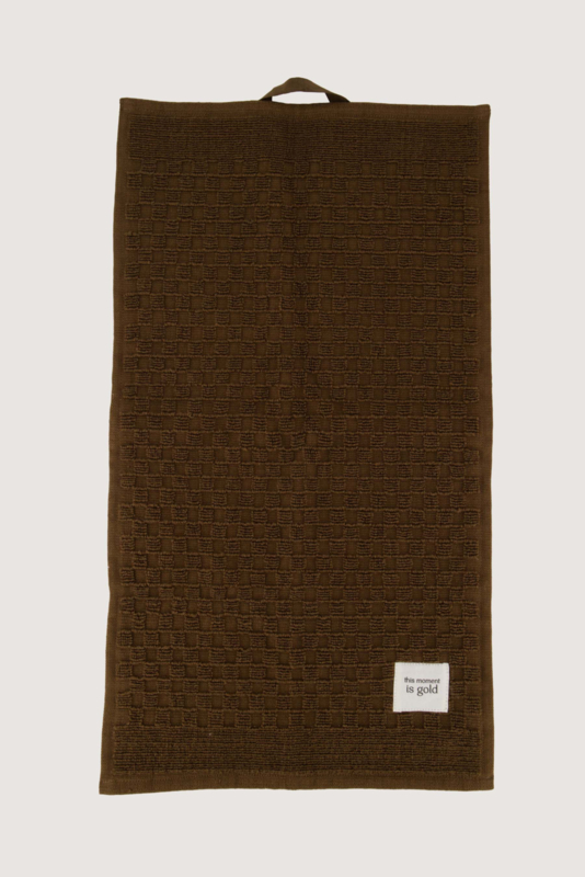 OverzichtDit mooie gastendoekje komt uit de nieuwe collectie van het merk Zusss. Het handdoekje is bruin van kleur en met relief is er een ruitpatroontje in te zien. Op een wit etiket in een hoekje staat met sierletters: this moment is gold. Het gastendoekje is gemaakt van 100% katoen en heeft de maat 30x55 cm. Het herkenbare Zusss logo vind je terug in de hoek en op de lus waarme het doekje op te hangen is.