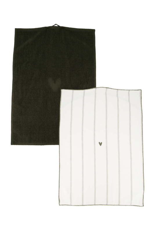 OverzichtDeze combinatie van een theedoek en handdoek is afkomstig uit de koken & tafelen collectie van het merk Zusss. De witte theedoek heeft een streeppatroonje met in het midden een hartje. De neutrale zachte handdoek is heel donkergroen en ook daarop staat in het midden een hartje. Zowel de handdoek en de theedoek zijn 50x70 cm groot en ze hebben beide een handige lus waaraan je ze kunt ophangen. Tip: combineer deze set met de bijpassende Zusss koken & tafelen artikelen.