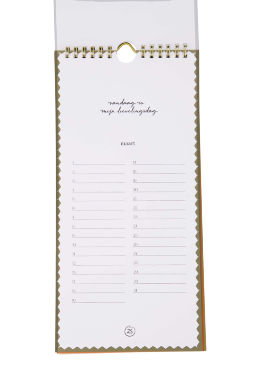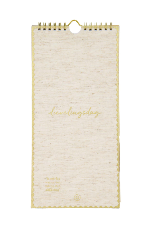 OverzichtNooit meer een verjaardag vergeten met een Zusss verjaardagskalender! De omslagkalender heeft een stevige kaft van linnen met de mooie tekst lievelingsdag in goudkleurige sierletters erop. De pagina's zijn voorgedrukt per maand zodat je alleen de namen van jouw familie en kennisen op de juiste datum hoeft te zetten. Hang deze decorative kalender op een goed zichtbare plaats en je zult geen verjaardag meer missen. De kalender is gemaakt van gerecycled papier en daarmee ook nog eens duurzaam.