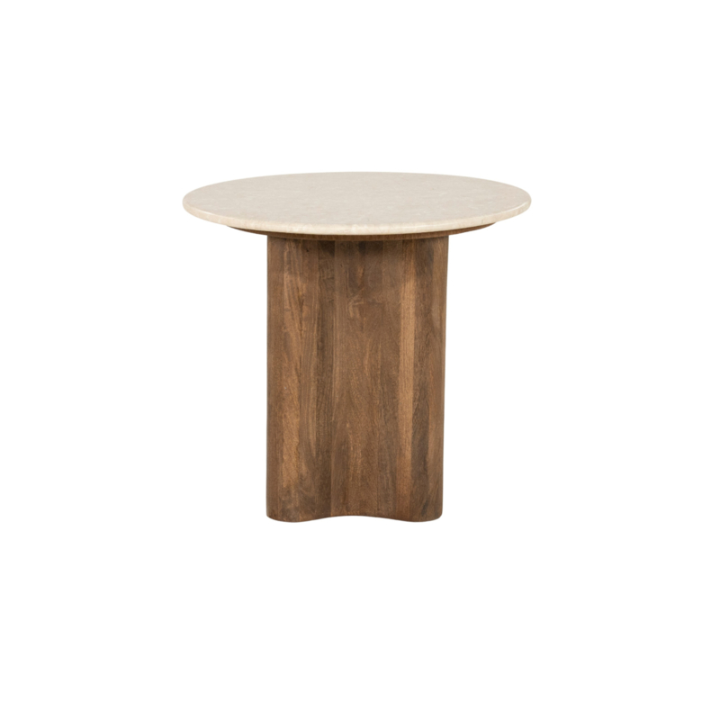 OverzichtBijzettafel Bodhi is afkomstig uit de marmeren tafels collectie van het merk Eleonora. Het ronde tafelblad is gemaakt van Botochino marmer in een lichte beige kleur. Het blad wordt gedragen door een masieve organisch gevormde poot van mango hout. De combinatie van natuurlijk marmer en het houten onderstel met zijn vloeiende vormgeving geven bijzettafel Bodhi een luxe uitstraling die zich moeiteloos aanpast in verschillende woonstijlen.