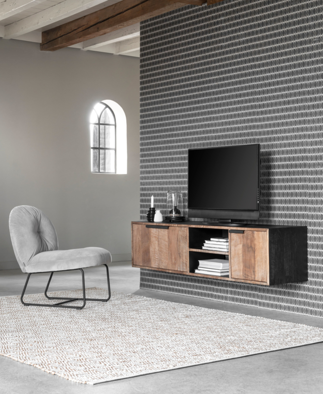 OverzichtDit prachtige, hangende TV meubel No.1 is afkomstig uit de Cosmo-serie van DTP Home. Het stoere meubel combineert naturel en zwart gerecycled teakhout en is voorzien van 3 deuren en 2 open vakken, de afmetingen van het televisiemeubel zijn: 40x165x40 cm (HxBxD). Omdat de poten van dit meubel ontbreken creëert het TV-meubel rust en harmonie aan de muur.