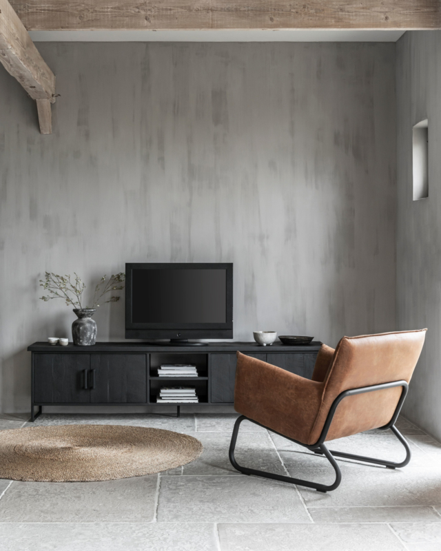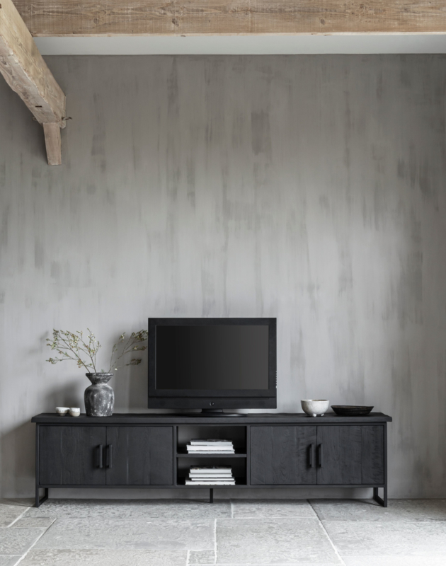 OverzichtDit prachtige, zwarte TV meubel Beam No.2 is afkomstig uit de Timeless Black Collection van DTP Home. Dit televisiemeubel combineert gerecycled teakhout met een zwart metalen frame. Het teakhout is voorzien van een zwarte beits en een transparante lak, hierdoor zijn de prachtige nerven nog goed zichtbaar in het hout. Het opvallende aan dit TV meubel is het ruw afgewerkte bovenblad, dit geef het meubel een stoere, rustieke uitstraling. Het kastje is voorzien van 2 deurtjes en 2 open vakken voor apparatuur. Het meubel is hier uitgevoerd in de maat 55x220x40 cm (HxBxD). De open vakken hebben de volgende afmetingen: 17x43 cm (HxB).