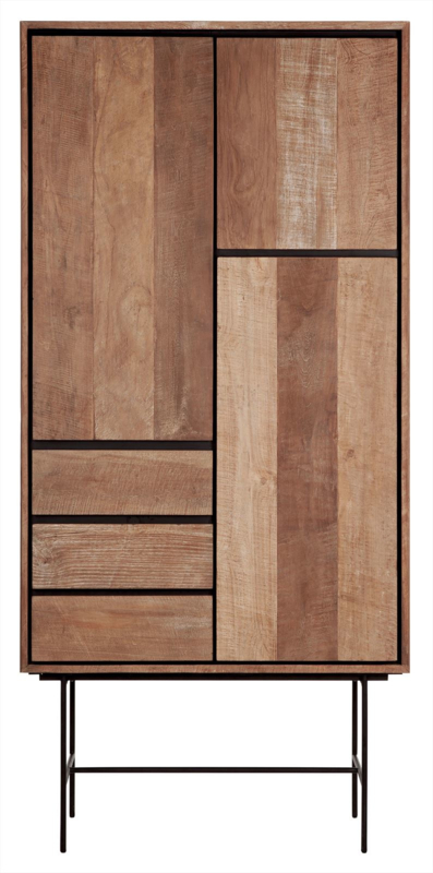 OverzichtDeze bergkast is afkomstig uit de Metropole Collection van DTP Home. De kast is gemaakt van gerecycled teakhout en heeft een rank, metalen onderstel. De asymmetische zwarte lijnen van deuren en lades zorgen voor een spannende vlakverdeling. Alle randen lopen schuin naar binnen, wat de voorkant van de kast structuur en diepte geeft. Deze hoge uitvoering heeft de volgende afmetingen: 210x100x40 cm (HxBxD) en is voorzien van 3 deuren en 3 laden. Achter de twee grote deurtjes bevinden zich ieder twee planken. Door de ranke poten oogt deze opbergkast Metropole niet zwaar. Maar met veel vakken, planken en laden biedt hij toch heel veel opbergruimte!
