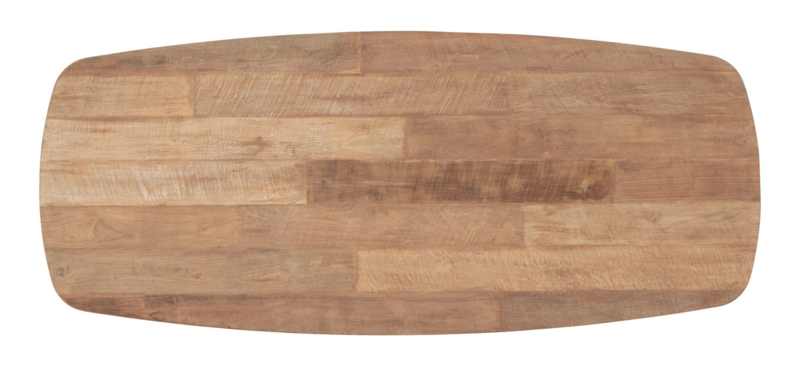OverzichtDeze prachtige, eettafel is afkomstig uit de Soho Collection van DTP Home. Het tafelblad heeft een Deens ovale vorm en is gemaakt van gerecycled teakhout waarin de kleuren van het verweerde teak elkaar afwisselen. Deze tafel heeft een lengte van 260 cm, een breedte van 110 cm en is 76 cm hoog. De rand is verjongd waardoor de tafel lijkt te zweven op de twee poten die ook aan de onderkant met elkaar verbonden zijn. Het model van deze metalen poten bied optimale zitruimte om de tafel heen en geeft de tafel in combinatie met het blad een stoere uitstraling.
