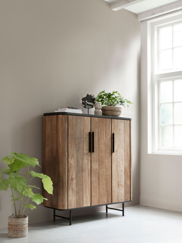 Deze stoere kast heeft afgeronde hoeken en is helemaal gesloten. Het gebruikte hout komt hierdoor prachtig uit en omdat de kast wat lager is komt ook het stoere bovenblad van Mortex goed tot zijn recht. Deze kast heeft drie deuren met achter elke deur twee planken. Hierdoor bied deze kast een maximum aan bergruimte. De kast heeft de volgende afmetingen: 130x120x40 cm (HxBxD).