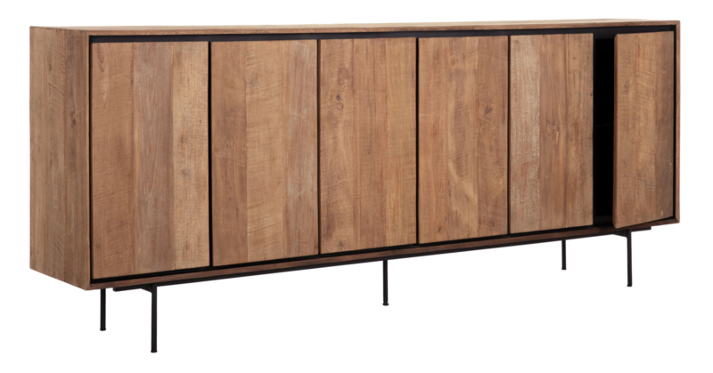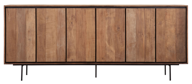 OverzichtDit dressoir op hoge poten is afkomstig uit de Metropole Collection van DTP Home. De kast is gemaakt van gerecycled teakhout en heeft een rank, metalen onderstel. De zwarte lijnen rondom de deuren zorgen voor een strakke vlakverdeling. Alle randen lopen schuin naar binnen, wat de voorkant van de kast structuur en diepte geeft. Het dressoir bevat zes deuren en heeft de volgende afmetingen: 90x220x40 cm (HxBxD). Achter elke deur bevind zich een plank waardoor de kast ook voldoende opbergruimte bied.
