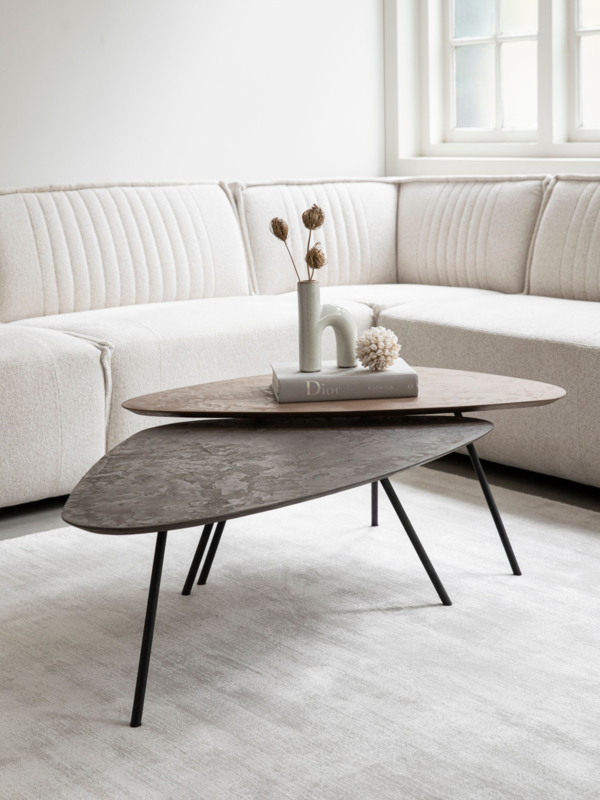 De tafels zijn 38x90x50 cm en 34x100x60 cm groot en het stoere blad rust op drie ranke metalen pootjes. De warme kleuren fludge en pepper zijn uitstekend op elkaar afgestemd en maken dat de tafelset zich aanpast naar diverse woonstijlen.