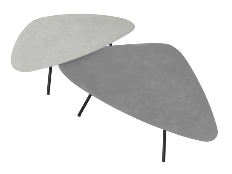 OverzichtDeze prachtige salontafelset is afkomstig uit de Scala Collection van DTP Home. De organisch gevormde driehoeken zijn verschillend van grote en van kleur wat een bijzonder speels en ruimtelijk effect geeft. Beide tafelbladen zijn gemaakt van Mortex, een nieuw materiaal wat steeds vaker te zien is in meubelstukken. Mortex bestaat voor 95% uit natuurproducten zoals mineralen, kalk en cement. Deze mix wordt handmatig aangebracht en hierdoor krijg je een unieke structuur en uitstraling, en een materiaal wat bijna net zo hard is als natuursteen. Elk blad vervaardigd uit Mortex is dan ook uniek.